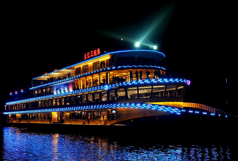 8号”游轮每日19:30从三峡游客中心出发,下行至宜万铁路大桥调头,上行途径天然塔、夷陵长江大桥、磨基山、镇江阁、葛洲坝等宜昌城市地标,后停靠至黄柏河码头。游船票价98元/人,宜昌市民凭身份证可享受优惠价48元/人,1.2米以下儿童免票。