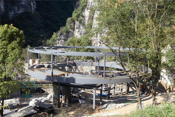首期投资约9000万元的“809微度假小镇”是一座综合性工业风主题酒店。从眼前的酒店大堂雏形,就可知它“不走寻常路”。这是一个巨大的环形钢结构建筑,有上下两层。现场工程房建负责人陈润超介绍,它是微度假小镇的标志性建筑,其环形的半径就达17.5米,采取多点支撑承重,建成后将拥有360°环形艺术走廊。全部工程的钢结构用量将超过400吨。