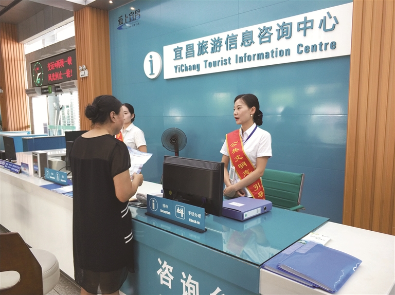 记者采访时,一名游客正在咨询台咨询旅游项目,中心员工陈晶晶披着“公共文明志愿引导员”的绶带,端正站立,微笑着为游客介绍有关宜昌的旅游产品。