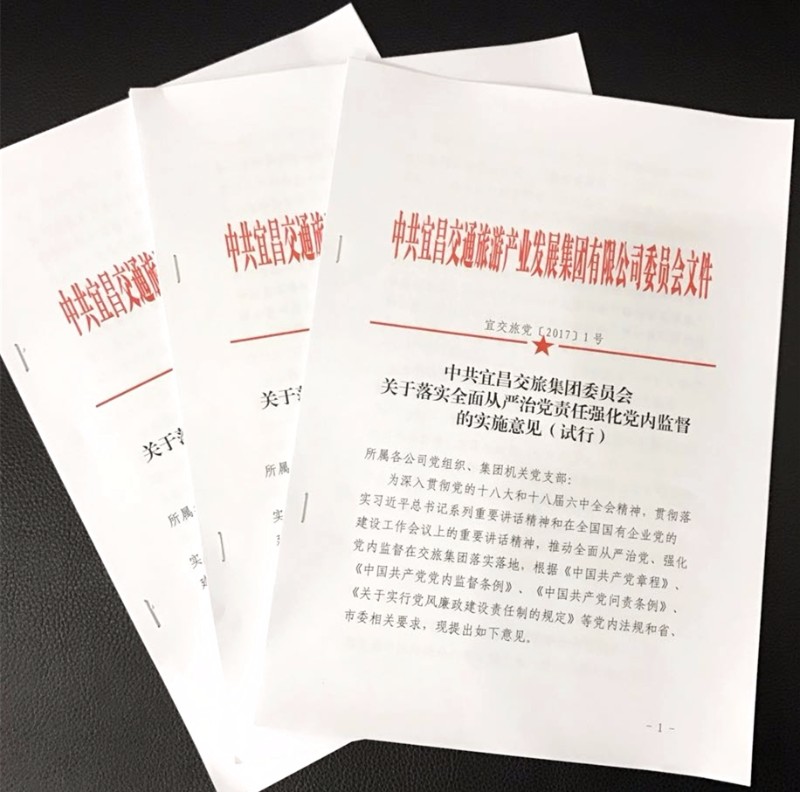为深入贯彻党的十八大和十八届六中全会精神,贯彻落实习近平总书记系列重要讲话精神和在全国国有企业党的建设工作会议上的重要讲话精神,推动全面从严治党在交旅集团落实落地,宜昌交旅集团党委研究制定《关于落实全面从严治党责任强化党内监督的实施意见(试行)》,进一步扎紧织密制度笼子,推动全面从严治党向纵深发展。