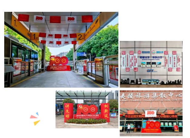 在红色文化站台和宜昌汽车客运中心站、夷陵旅游集散中心前广场,建党百年的红色展牌夺目“吸睛”,引得不少市民驻足合影。