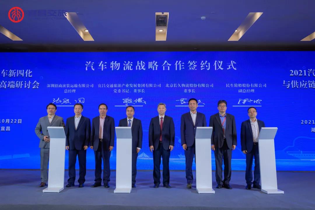 会上,宜昌交旅集团董事长殷俊与北京长久物流股份有限公司董事长薄世久,深圳招商滚装运输有限公司总经理张爱国,民生轮船股份有限公司副总经理陈文波签署汽车物流战略合作协议,共同谋划做大做强三峡翻坝汽车物流业务,强化宜昌汽车产业全链服务和全渠道运营能力,优化汽车产业供应链生态圈。