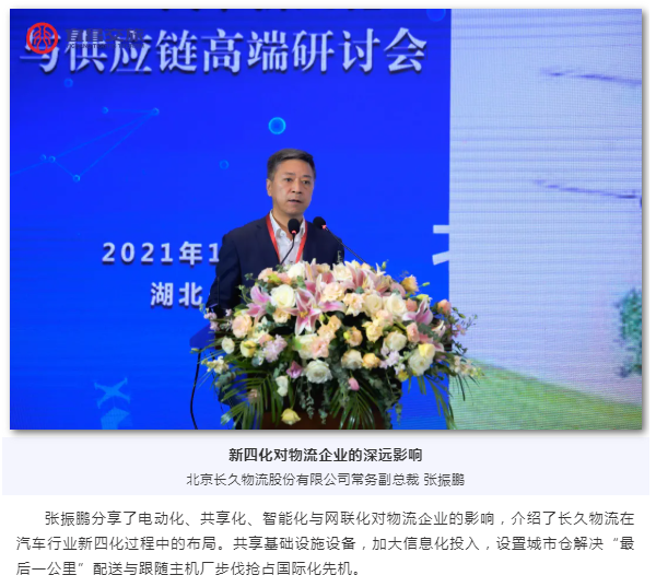 总经理谢普乐,北京长久物流股份有限公司常务副总裁张振鹏,中物联汽车物流分会秘书长左新宇分别围绕汽车新四化对经济、产业、市场、企业的影响作专题演讲。