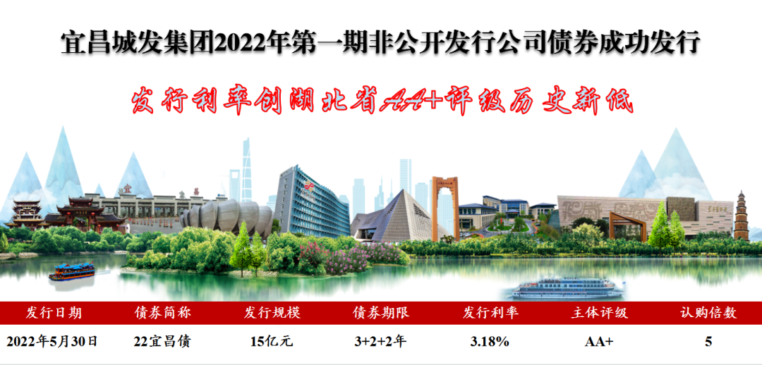 5月30日,宜昌城发集团成功发行2022年首只私募公司债券,额度15亿元,发行期限7年,全场认购超过5倍,发行利率3.18%,创湖北省AA+评级私募公司债券发行利率历史新低。