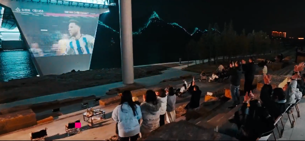 2022年12月6日,夷陵长江大桥下,追光而来的“球迷”们欢聚一堂,凝神观看投影在桥墩上的卡塔尔世界杯。