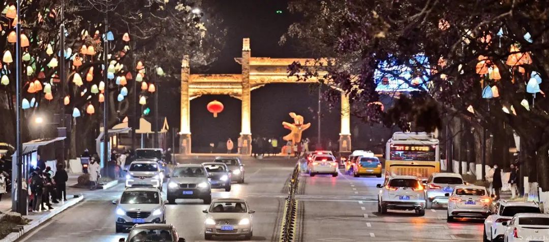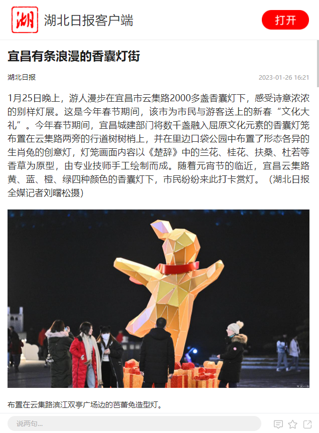 1月25日晚上,游人漫步在宜昌市云集路2000多盏香囊灯下,感受诗意浓浓的别样灯展。这是今年春节期间,该市为市民与游客送上的新春“文化大礼”。今年春节期间,宜昌城建部门将数千盏融入屈原文化元素的香囊灯笼布置在云集路两旁的行道树树梢上,并在里边口袋公园中布置了形态各异的生肖兔的创意灯,灯笼画面内容以《楚辞》中的兰花、桂花、扶桑、杜若等香草为原型,由专业技师手工绘制而成。随着元宵节的临近,宜昌云集路黄、蓝、橙、绿四种颜色的香囊灯下,市民纷纷来此打卡赏灯。