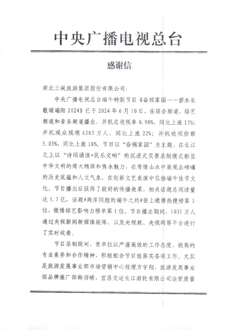 借势做好活动宣发工作,利用两坝一峡在本土地区的宣传效应,扩大节目在宜昌地区的影响力。配合央视节目宣发组,策划明星有奖竞猜活动,在两坝一峡旅游视频号、抖音号发布《浓情端午,“粽”览三峡》预热视频、两坝一峡游轮节目录制现场花絮、《中央广播电视总台&两坝一峡》等视频,助力央视端午特别节目和两坝一峡宣传曝光最大化。据统计,《奋楫家国——碧水长歌颂端阳2024》总收视率0.98%,观众规模6283万人,相关话题总阅读量达5.7亿。