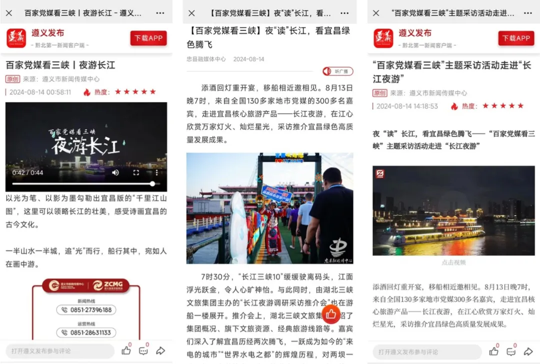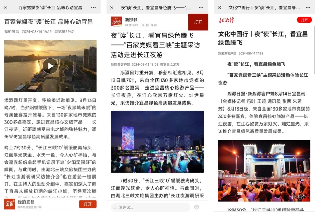 截止目前,中国新闻社、湖北日报、荆楚网、长江云、石家庄日报、许昌日报、安顺日报、三明日报、廊坊日报、渭南日报、湘潭日报、临沂日报、沧州日报、湄洲日报、十堰日报、连云港日报、岳阳日报、银川发布、遵义发布、黔江融媒、长沙晚报、郑州晚报、泉州晚报、岳阳晚报、中卫市新闻传媒中心、忠县融媒体中心、雅安市融媒体中心、神农架融媒体中心、遵义市新闻传媒中心、黔东南州融媒体中心、丽水市新闻传媒中心、荆州市融媒体中心、我的宜昌、宜昌发布、三峡日报等全国54家媒体争相报道,微信公众号、微博、抖音、视频号、客户端等线上新媒体全面开花。