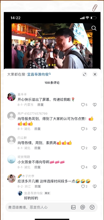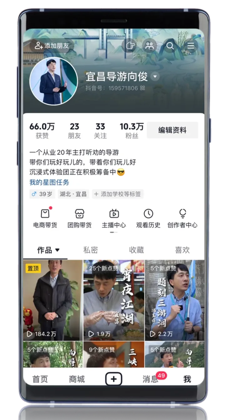 2024年3月,借助“与辉同行”来宜带货契机,抖乐科技公司成立工作小组孵化“宜昌导游向俊”IP账号。打造内容视频获赞破65万次,曝光量达到1500W+,粉丝增长10万人;通过视频、直播推广宜昌优质景区及品牌,同步打造“向导带你游宜昌”线路游IP,助推宜昌文旅资源破界出圈,后续将拓展线路资源及“导服”团队,形成品牌矩阵。