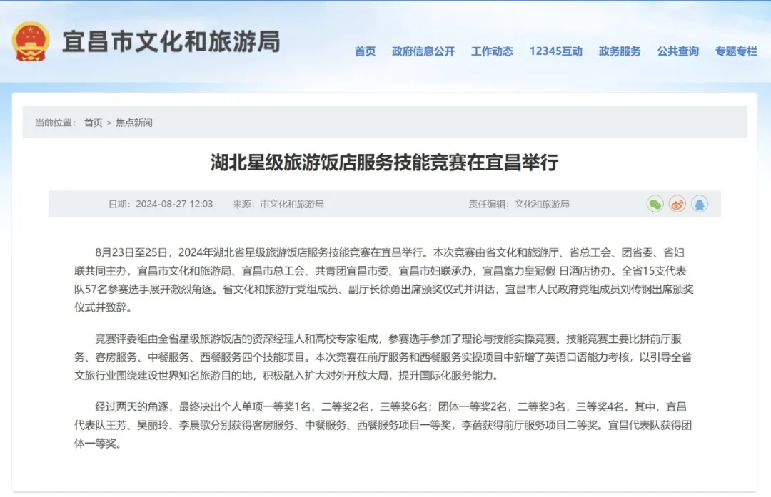 8月23日至25日,2024年湖北省星级旅游饭店服务技能竞赛在宜昌举行。本次竞赛由省文化和旅游厅、省总工会、团省委、省妇联共同主办,宜昌市文化和旅游局、宜昌市总工会、共青团宜昌市委、宜昌市妇联承办,宜昌富力皇冠假日酒店协办。全省15支代表队57名参赛选手展开激烈角逐。省文化和旅游厅党组成员、副厅长徐勇出席颁奖仪式并讲话,宜昌市人民政府党组成员刘传钢出席颁奖仪式并致辞。