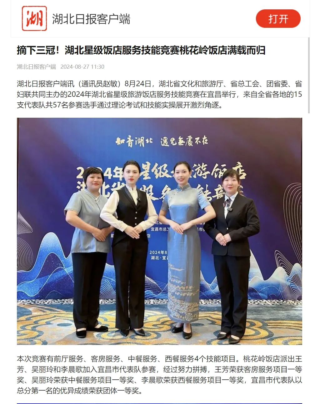 本次竞赛设有4个技能项目湖北三峡文旅集团旗下桃花岭饭店获得其中3项的一等奖!并以总分第一名的优异成绩荣获团体一等奖。央广网、湖北文旅、湖北日报、宜昌市文化和旅游局、三峡新闻网等多家媒体争相报道。