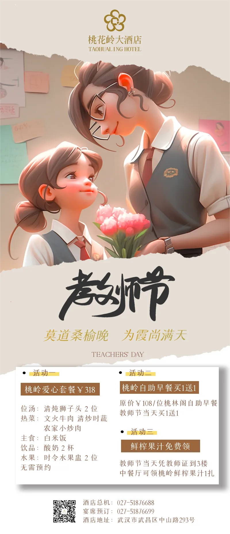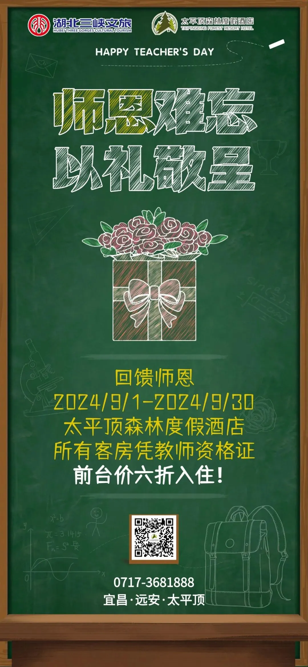 9月10日教师节当天,凭教师资格证菜品8.8折优惠(海鲜酒水除外),消费金额达1500元赠送客房体验一间/夜。