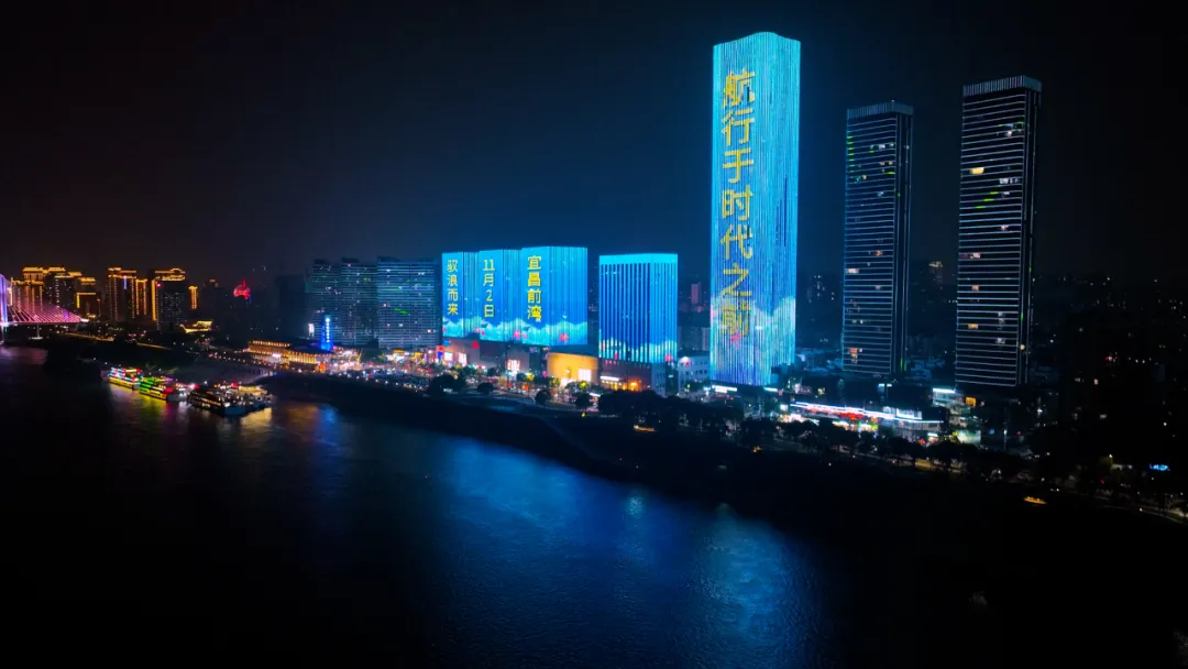 与“宜昌远影号”同步惊艳宜昌的,还有11月1日晚举办的“前湾点亮宜昌”灯光秀活动。“航行于时代之前”、“宜昌前湾”、“驭浪而来”等巨幅标语同步点亮宜昌十余座滨江地标建筑,为宜昌世界级湾区的启幕谱写序章。