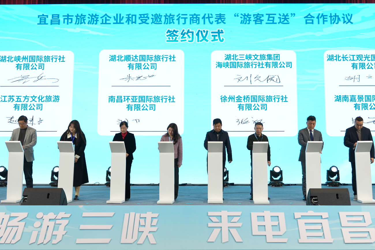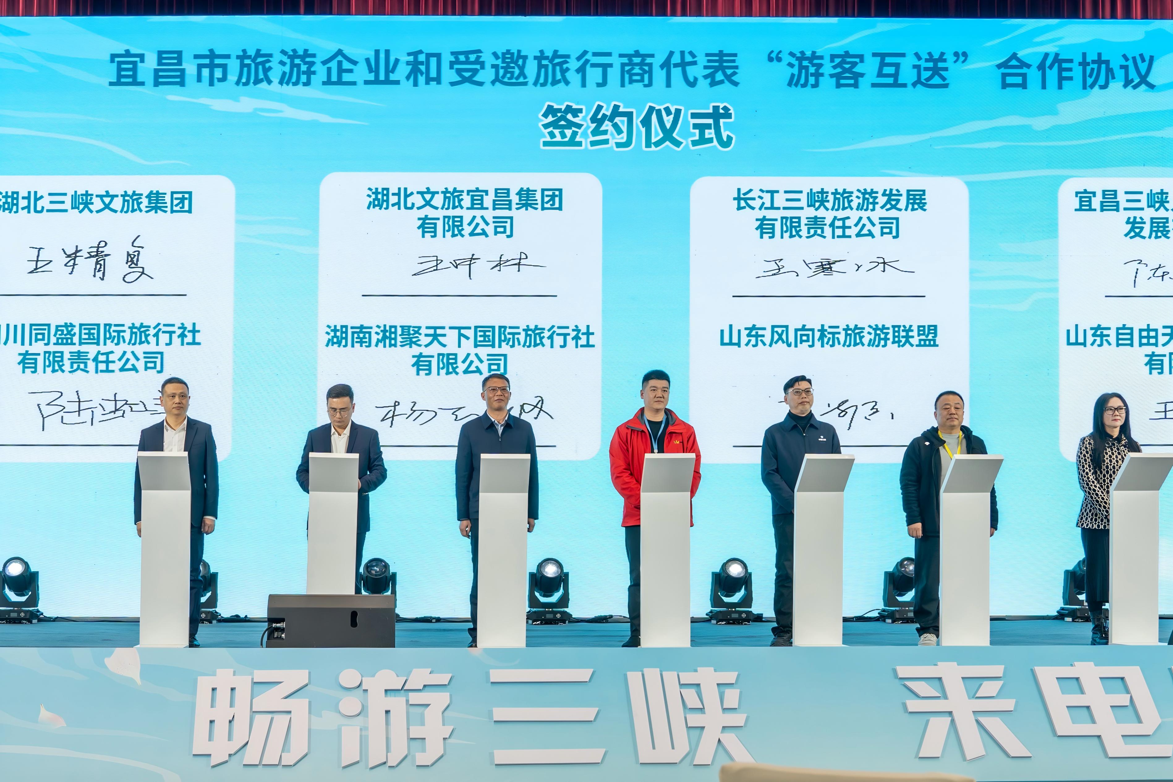 2月18日,“畅游三峡 来电宜昌”2025年全国旅行商春季宜昌行活动启动仪式在三峡文旅集团旗下三峡宾馆举行。200余家来自全国各地的旅行商、80多家宜昌重点文旅企业以及文旅达人欢聚一堂。启动仪式上,三峡文旅集团与四川同盛国际旅行社有限责任公司,集团旗下海峡国际旅行社与徐州金桥国际旅行社有限公司签订合作协议,双方达成联合营销、资源共享、游客互送合作。三峡文旅集团向全国旅行商做产品推介。