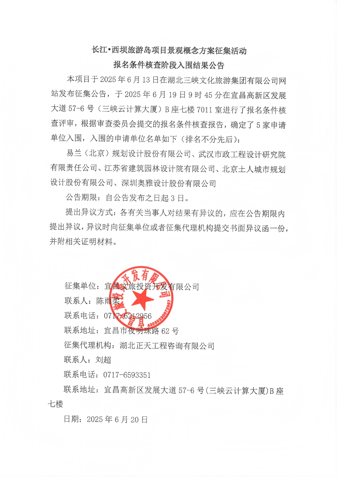长江•西坝旅游岛项目景观概念方案征集活动 报名条件核查阶段入围结果公告