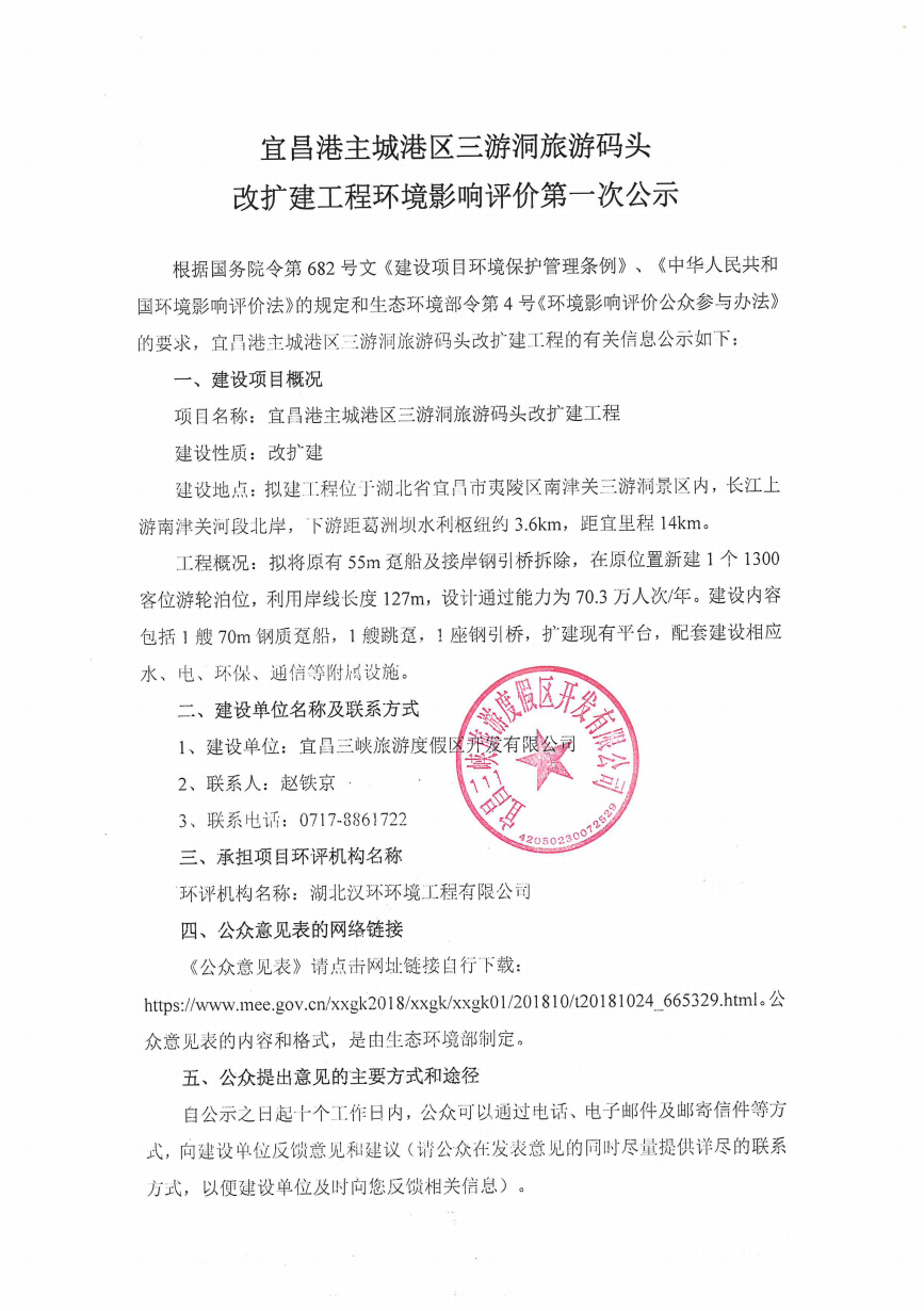 根据国务院令第682号文《建设项目环境保护管理条例》、《中华人民共和国环境影响评价法》的规定和生态环境部令第4号《环境影响评价公众参与办法》的要求,宜昌港主城港区三游洞旅游码头改扩建工程的有关信息公示如下: